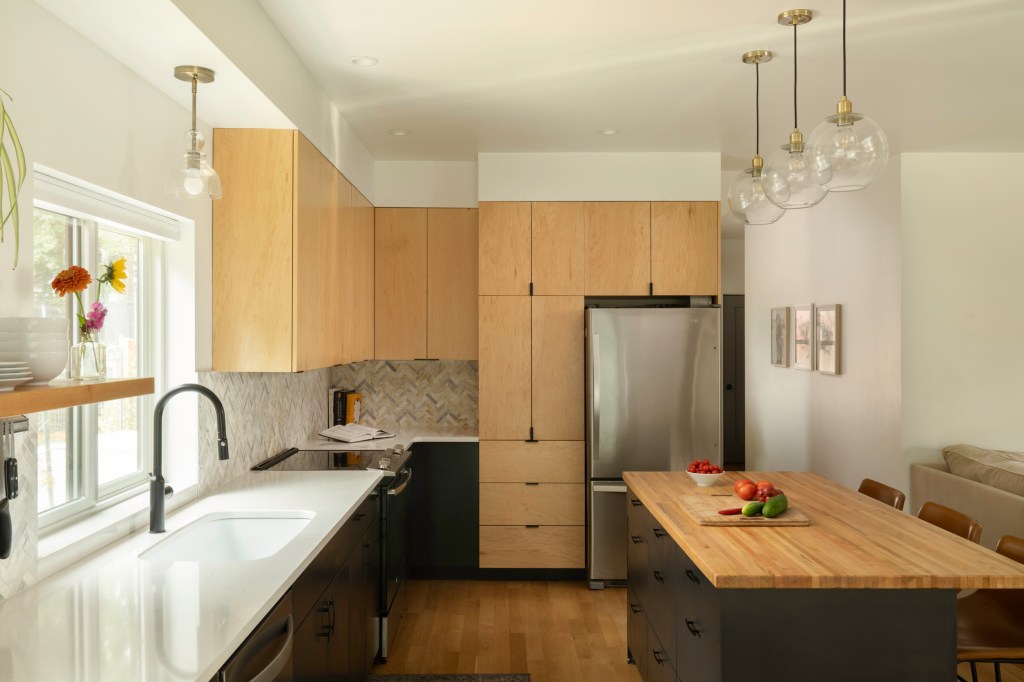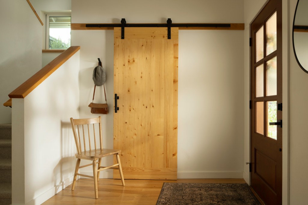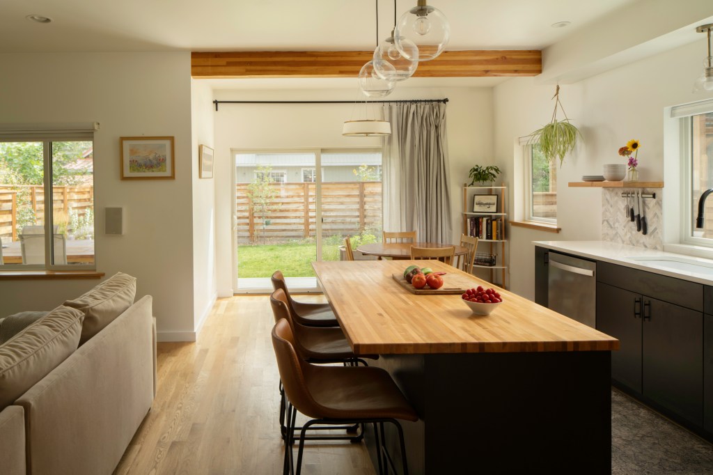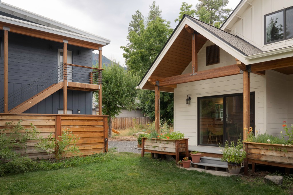Located on a small City lot, this project consists of a small family home and a generous garage with an ADU above. The home provides three bedrooms and two full bathrooms in just under 1200 square feet. The small size was driven by containing cost, practicing a minimalist lifestyle, and the possibility of converting the house to another ADU to serve future needs. Circulation is contained in the center of the house, with a clear line from the front porch to the back deck. This allows for rooms on either side of the pathways to be used more fully.