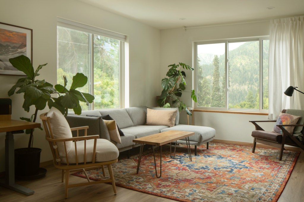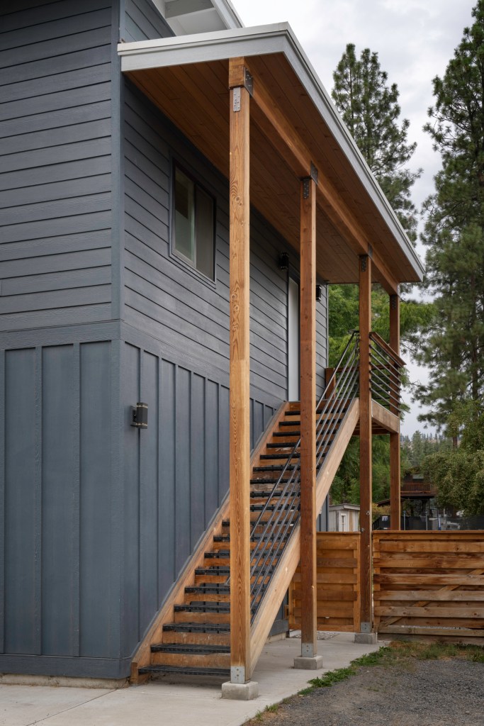 The ADU style varies from the house so it does not appear as an extension of the house, but its own structure. Windows are maximized in the space to give it a treehouse feel.
